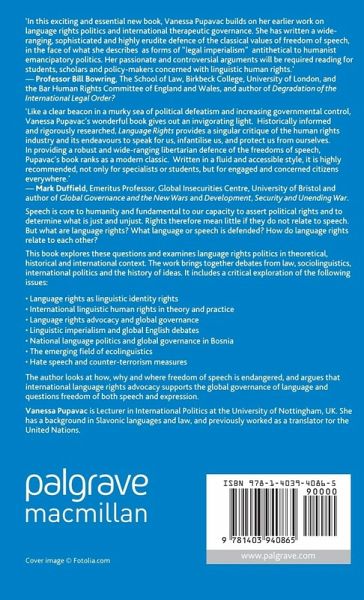 Exploring language rights politics in theoretical, historical and international context, this book brings together debates from law, sociolinguistics, international politics, and the history of ideas. The author argues that international language rights advocacy supports global governance of language and questions freedoms of speech and expression.