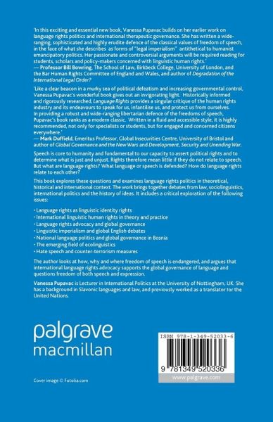Exploring language rights politics in theoretical, historical and international context, this book brings together debates from law, sociolinguistics, international politics, and the history of ideas. The author argues that international language rights advocacy supports global governance of language and questions freedoms of speech and expression.