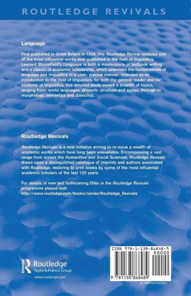 First published in Great Britain in 1935, this Routledge Revival reissues one of the most influential works ever published in the field of linguistics. Leonard Bloomfield's Language is both a masterpiece of textbook writing and a classic of academic scholarship, which examines the fundamentals of language and linguistics in a clear, precise manner. Intended as an introduction to the field of linguistics, for both the general reader and for students of linguistics, this detailed study covers a breadth of topics, ranging from: world languages, phonetic structure and syntax, through to morphology, semantics and dialectics.