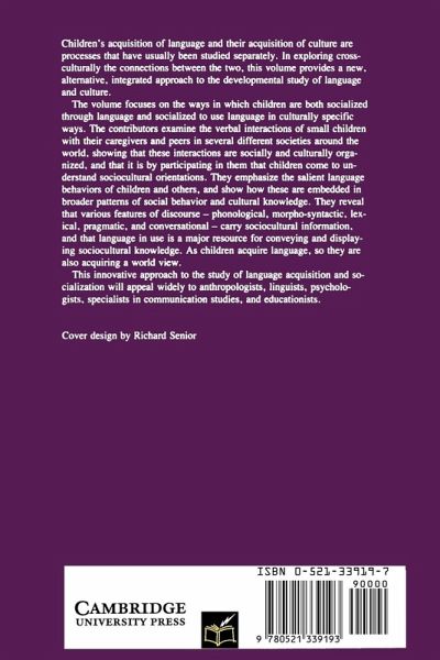 Children's acquisition of language and their acquisition of culture are processes that have usually been studied separately. In exploring cross-culturally the connections between the two, this volume provides a new, alternative, integrated approach to the developmental study of language and culture. The volume focuses on the ways in which children are both socialized through language and socialized to use language in culturally specific ways. The contributors examine the verbal interactions of small children with their caregivers and peers in several different societies around the world, showing that these interactions are socially and culturally organized, and that it is by participating in them that children come to understand sociocultural orientations. They emphasize the salient language behaviors of children and others, and show how these are embedded in broader patterns of social behavior and cultural knowledge. They reveal that various features of discourse -- phonological, morpho-syntactic, lexical, pragmatic, and conversational -- carry sociocultural information, and that language in use is a major resource for conveying and displaying sociocultural knowledge. As children acquire language, so they are also acquiring a world view. This innovative approach to the study of language acquisition and socialization will appeal widely to anthropologists, linguists, psychologists, specialists in communication studies, and educationists.