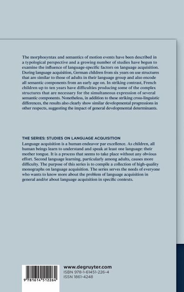 A growing number of studies have begun to examine the influence of language-specific factors on language acquisition. During language acquisition, German children from six years on use structures that are similar to those of adults in their language group and also encode all semantic components from an early age. In striking contrast, French children up to ten years have difficulties producing some of the complex structures that are necessary for the simultaneous expression of several semantic components. Nonetheless, in addition to these striking cross-linguistic differences, the results of this study also clearly show similar developmental progressions in other respects, suggesting the impact of general developmental determinants.