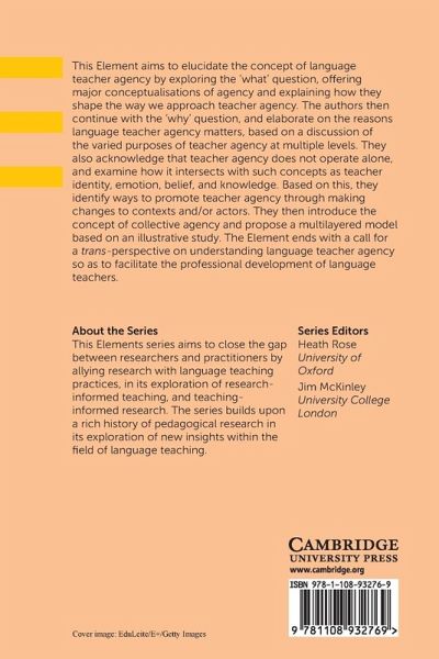 This Element aims to inform readers about what is known about language teacher agency, and why it matters for language teachers. It reviews how the notion of teacher agency enables researchers to explore and understand language teachers' pedagogical practice and pursuit of professional development as mediated by contextual conditions.