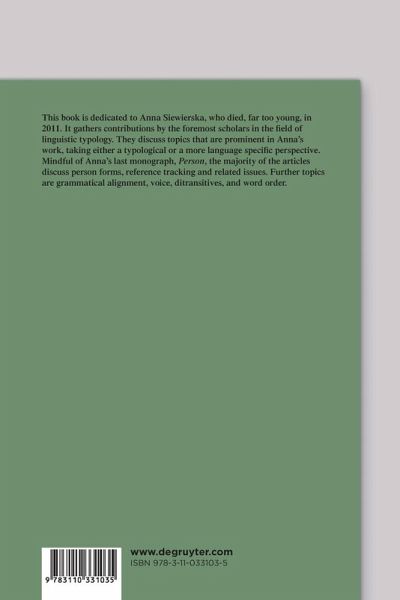 This book is dedicated to Anna Siewierska, who died, far too young, in 2011. It contains 15 contributions by 20 linguists who may be counted among the foremost scholars in the field of linguistic typology. All of these articles discuss a topic that is prominent in Anna's work, whose journal articles and monographs on the passive, on word order, and on the category of person are standard literature in these respective fields. Mindful of Anna's last monograph, Person, the majority of the contributions in this volume discuss free and bound person forms, argument indexing, reference tracking systems, impersonals, and related issues, such as suppletion and incompleteness in person paradigms, the origin of referential systems, dependent versus independent marking, and referential hierarchies. Other topics are grammatical alignment, grammatical voice, ditransitives, and word order. Most of the contributions take a broad, typological perspective. Others give a more in depth treatment, based on data from a specific language, notably Spanish, Russian, Mandinka, and Mohawk. The book contains a complete bibliography of Anna Siewierska's linguistic production.
