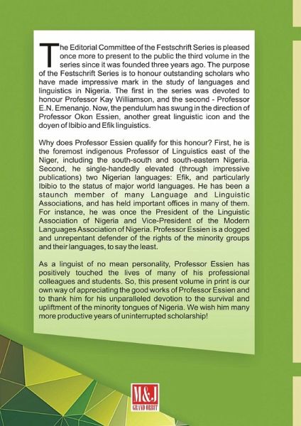 Language and Culture in Nigeria contains 97 papers from a wide range of areas in Language and Linguistics written by colleagues, friends and former students of Professor Okon Essien. The collection fulfills a gap in the quest for a documented piece of work on the general pattern and structure of Nigerian names and is an invaluable material for comparative purposes. There are 19 papers in section A focusing mainly on various aspects of sociolinguistics and the role of language in society. Section B comprises 24 papers which fall in the area of stylistics, literature and gender studies. Section C contains 21 papers focusing on applied areas of linguistics. Section D comprises 11 papers on information science and communication studies. Section E contains papers that focus on the formal areas of linguistics, i.e. phonetics, phonology, morphology, syntax & semantics. Section F is on Okon Essien as a celebrity. It comprises papers which not only x-ray the contributions of the celebrity to the study of languages and linguistics in Nigeria, but also situate him in the context of other linguistic celebrities globally. Section F is rapped up with a collection of brilliant poems dedicated to Professor Okon Essien by the ‘Ode Grandmaster’, Dr. Obed Ojukwu. There is also an appendix at the end of the work which is Professor Okon Essien’s intimidating curriculum vitae.