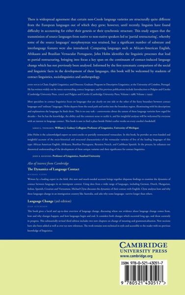 There is widespread agreement that certain non-Creole language varieties are structurally quite different from the European languages out of which they grew; however, until recently, linguists have found difficulty in accounting for either their genesis or their synchronic structure. This 2003 study argues that the transmission of source languages from native to non-native speakers led to 'partial restructuring', whereby some of the source languages' morphosyntax was retained, but a significant number of substrate and interlanguage features were also introduced. Comparing languages such as African-American English, Afrikaans and Brazilian Vernacular Portuguese, John Holm identifies the linguistic processes that lead to partial restructuring, bringing into focus a key span on the continuum of contact-induced language change which has not previously been analysed. Informed by the first systematic comparison of the social and linguistic facts in the development of these languages, this book will be welcomed by students of contact linguistics, sociolinguistics and anthropology.