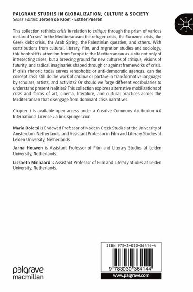 This collection rethinks crisis in relation to critique through the prism of various declared 'crises' in the Mediterranean: the refugee crisis, the Eurozone crisis, the Greek debt crisis, the Arab Spring, the Palestinian question, and others. With contributions from cultural, literary, film, and migration studies and sociology, this book shifts attention from Europe to the Mediterranean as a site not only of intersecting crises, but a breeding ground for new cultures of critique, visions of futurity, and radical imaginaries shaped through or against frameworks of crisis. If crisis rhetoric today serves populist, xenophobic or anti-democratic agendas, can the concept crisis still do the work of critique or partake in transformative languages by scholars, artists, and activists? Or should we forge different vocabularies to understand present realities? This collection explores alternative mobilizations of crisis and forms of art, cinema, literature, and cultural practices across the Mediterranean that disengage from dominant crisis narratives.
