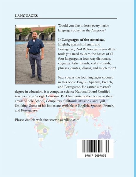 Would you like to learn every major language spoken in the Americas? In Languages of the Americas: English, Spanish, French, and Portuguese, Paul Rallion gives you all the tools you need to learn the basics of all four languages: a four-way dictionary, cognates, false friends, verbs, sounds, phrases, quotes, idioms, and much more! Did you know the author is a polyglot? Paul speaks the four languages covered in this book: English, Spanish, French, and Portuguese. He earned a master's degree in education, is a computer science National Board Certified teacher and a Google Educator. Paul has written other books in these areas: Middle School, Computers, California Missions, and Quit Smoking. Some of his books are available in English, Spanish, French, and Portuguese. Please visit his web site: www.paulrallion.com