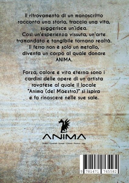 Il ritrovamento di un manoscritto racconta una storia, traccia una vita, suggerisce un'idea. Così un'esperienza vissuta, un'arte tramandata e tangibile tornano realtà. Il ferro non è solo un metallo, diventa un corpo al quale donare ANIMA. Forza, calore e vita eterna sono i cardini delle opere di un artista rovatese al quale il locale "Anima (del Maestro)" si ispira e fa rinascere nelle sue sale.