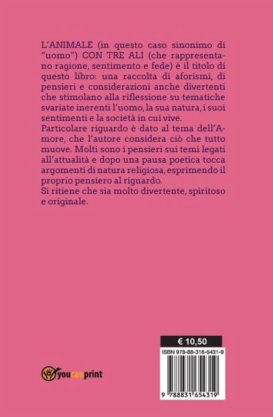 L'ANIMALE (in questo caso sinonimo di "uomo") CON TRE ALI (che rappresentano ragione, sentimento e fede) è il titolo di questo libro: una raccolta di aforismi, di pensieri e considerazioni anche divertenti che stimolano alla riflessione su tematiche svariate inerenti l'uomo, la sua natura, i suoi sentimenti e la società in cui vive. Particolare riguardo è dato al tema dell'Amore, che l'autore considera ciò che tutto muove. Molti sono i pensieri sui temi legati all'attualità e dopo una pausa poetica tocca argomenti di natura religiosa, esprimendo il proprio pensiero al riguardo. Si ritiene che sia molto divertente, spiritoso e originale.