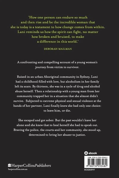 'How one person can endure so much and then rise and be the incredible woman that she is today is a testament to how change comes from within. Lani reminds us how the spirit can fight, no matter how broken and bruised, to make a difference in this world.' Deborah Mailman A confronting and compelling account of a young woman's journey from victim to survivor. Raised in an urban Aboriginal community in Sydney, Lani had a childhood filled with love but alcoholism in her family left its scars. By thirteen, she was in a cycle of drug and alcohol abuse herself. then a relationship with a young man from her community trapped her in a situation that she almost didn't survive. Subjected to extreme physical and sexual violence at the hands of her partner, Lani finally knew she had only one choice: to leave him, or die. She escaped and got sober. But the past wouldn't leave her alone and she knew that to heal herself she had to speak out. Braving the police, the courts and her community, she stood up, determined to bring her abuser to justice.