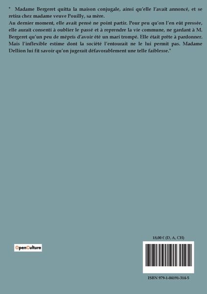 " Madame Bergeret quitta la maison conjugale, ainsi qüelle l¿avait annoncé, et se retira chez madame veuve Pouilly, sa mère. Au dernier moment, elle avait pensé ne point partir. Pour peu qüon l¿en eût pressée, elle aurait consenti à oublier le passé et à reprendre la vie commune, ne gardant à M. Bergeret qüun peu de mépris d¿avoir été un mari trompé. Elle était prête à pardonner. Mais l¿inflexible estime dont la société l¿entourait ne le lui permit pas. Madame Dellion lui fit savoir qüon jugerait défavorablement une telle faiblesse."