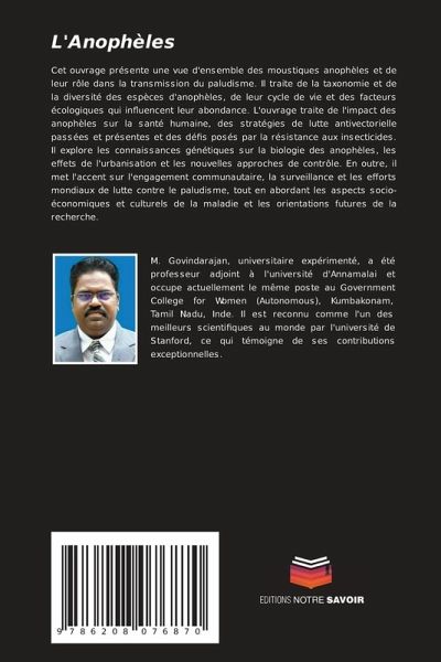 Cet ouvrage présente une vue d'ensemble des moustiques anophèles et de leur rôle dans la transmission du paludisme. Il traite de la taxonomie et de la diversité des espèces d'anophèles, de leur cycle de vie et des facteurs écologiques qui influencent leur abondance. L'ouvrage traite de l'impact des anophèles sur la santé humaine, des stratégies de lutte antivectorielle passées et présentes et des défis posés par la résistance aux insecticides. Il explore les connaissances génétiques sur la biologie des anophèles, les effets de l'urbanisation et les nouvelles approches de contrôle. En outre, il met l'accent sur l'engagement communautaire, la surveillance et les efforts mondiaux de lutte contre le paludisme, tout en abordant les aspects socio-économiques et culturels de la maladie et les orientations futures de la recherche.
