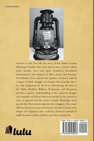 Lanterns at Our Feet tells the story of five Amite County, Mississippi families that were forced into a system where many families were torn apart, brutalized, humiliated, dehumanized and stripped of their names and heritage. Nevertheless, they endured the injustice of slavery and left a legacy of their struggle and lessons that provides day-to-day inspiration for all of us. Discovering the lives of the Butts, Bradleys, Walkers, Robinsons and Kenersons provides a greater understanding of the common struggle and triumphs of African American people in the American story in general and the Amite County Mississippi story specifically. Their stories represent the struggles of the many African-American men and women of Amite County who, despite the injustices they endured, advanced onward to uplift themselves, their families, and their community.