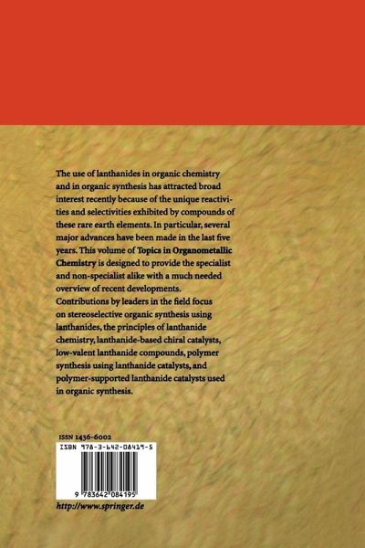 The use of lanthanides in organic chemistry and in organic synthesis has attracted broad interest recently because of the unique reactivities and selectivities exhibited by compounds of these rare earth elements. In particular, several major advances have been made in the last five years. This volume of Topics in Organometallic Chemistry is designed to provide the specialist and non-specialist alike with a much needed overview of recent developments. Contributions by leaders in the field focus on stereoselective organic synthesis using lanthanides, the principles of lanthanide chemistry, lanthanide-based chiral catalysts, low-valent lanthanide compounds, polymer synthesis using lanthanide catalysts, and polymer-supported lanthanide catalysts used in organic synthesis.