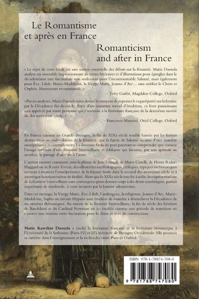 «Le sujet de cette étude est une source essentielle des débats sur la féminité. Marie Daouda analyse un ensemble impressionnant de textes littéraires et d'illustrations pour épingler dans le décadentisme une fascination non seulement pour l'incontournable Salomé, mais également pour Ève, Lilith, Marie-Madeleine, la Vierge Marie, Jeanne d'Arc... sans oublier le Christ et Orphée. Hautement recommandé.» (Toby Garfitt, Magdalen College, Oxford)