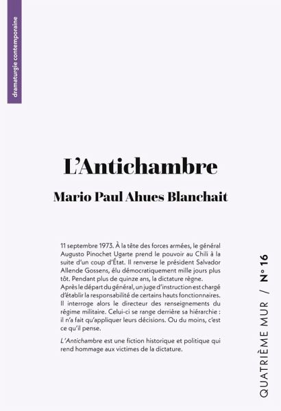 11¿septembre 1973. À la tête des forces armées, le général Augusto Pinochet Ugarte prend le pouvoir au Chili à la suite d'un coup d'État. Il renverse le président Salvador Allende Gossens, élu démocratiquement mille jours plus tôt. Pendant plus de quinze ans, la dictature règne. Après le départ du général, un juge d'instruction est chargé d'établir la responsabilité de certains hauts fonctionnaires. Il interroge alors le directeur des renseignements du régime militaire. Celui-ci se range derrière sa hiérarchie¿: il n'a fait qu'appliquer leurs décisions. Ou du moins, c'est ce qu'il pense. L'Antichambre est une fiction historique et politique qui rend hommage aux victimes de la dictature.