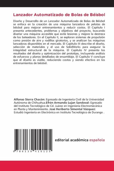 Diseño y Desarrollo de un Lanzador Automatizado de Bolas de Béisbol se enfoca en la creación de una máquina lanzadora de pelotas de béisbol para mejorar entrenamientos y reducir costos. El Capítulo I presenta antecedentes, problemas y objetivos del proyecto, buscando diseñar una máquina accesible que evite lesiones y mejore la destreza de los bateadores. En el Capítulo II, se exploran sistemas de propulsión como presión de aire y rodillos giratorios, y se analizan las máquinas lanzadoras disponibles en el mercado. El Capítulo III describe el diseño, selección de materiales y el uso de SolidWorks para asegurar la integridad estructural de la máquina. El Capítulo IV presenta los resultados del diseño y optimización del prototipo, incluyendo análisis de esfuerzos y planos detallados de ensamblaje. El Capítulo V concluye que el diseño es viable, reduciendo costos y siendo efectivo en los entrenamientos de béisbol.