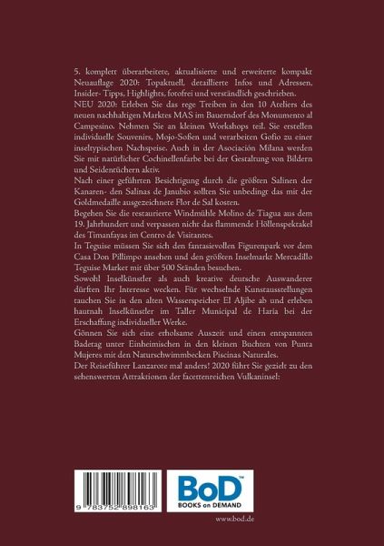 5. komplett überarbeitete, aktualisierte und erweiterte kompakt Neuauflage 2020: Topaktuell, detaillierte Infos und Adressen, Insider- Tipps, Highlights, fotofrei und verständlich geschrieben.NEU 2020: Erleben Sie das rege Treiben in den 10 Ateliers des neuen nachhaltigen Marktes MAS im Bauerndorf des Monumento al Campesino. Nehmen Sie an kleinen Workshops teil. Sie erstellen individuelle Souvenirs, Mojo-Soßen und verarbeiten Gofio zu einer inseltypischen Nachspeise. Auch in der Asociación Milana werden Sie mit natürlicher Cochinellenfarbe bei der Gestaltung von Bildern und Seidentüchern aktiv. Nach einer geführten Besichtigung durch die größten Salinen der Kanaren- den Salinas de Janubio sollten Sie unbedingt das mit der Goldmedaille ausgezeichnete Flor de Sal kosten. Begehen Sie die restaurierte Windmühle Molino de Tiagua aus dem 19. Jahrhundert und verpassen nicht das flammende Höllenspektakel des Timanfayas im Centro de Visitantes.In Teguise müssen Sie sich den fantasievollen Figurenpark vor dem Casa Don Pillimpo ansehen und den größten Inselmarkt Mercadillo Teguise Market mit über 500 Ständen besuchen. Sowohl Inselkünstler als auch kreative deutsche Auswanderer dürften Ihr Interesse wecken. Für wechselnde Kunstausstellungen tauchen Sie in den alten Wasserspeicher El Aljibe ab und erleben hautnah Inselkünstler im Taller Municipal de Haría bei der Erschaffung individueller Werke.Gönnen Sie sich eine erholsame Auszeit und einen entspannten Badetag unter Einheimischen in den kleinen Buchten von Punta Mujeres mit den Naturschwimmbecken Piscinas Naturales.Der Reiseführer Lanzarote mal anders! 2020 führt Sie gezielt zu den sehenswerten Attraktionen der facettenreichen Vulkaninsel: Blicken Sie im Norden vom Mirador del Río auf die pittoreske Nachbarinsel La Graciosa mit ihren traumhaften Sandstränden. Erkunden Sie in den Höhlen Cuevas de los Verdes das Herz der Erde und beobachten Sie die weltweit einzigartigen Albino- Krebse in den Jameos del Agua. Sehen Sie weit über 1000 verschiedene Kakteenarten im Jardín de Cactus und blicken von der Piratenburg Castillo Santa Barbara auf die alte Inselhauptstadt Teguise. Besuchen Sie die das berühmte Haus mit den unterirdischen Vulkanblasen in der Fundación César Manrique und lassen Sie sich nicht das exzentrische Anwesen des Schauspielers Omar Sharif im Lagomar entgehen. Vom Monumento al Campesino mit dem Bauernmuseum machen Sie sich durch das einzigartige Weinanbaugebiet La Geria