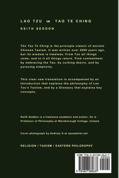 This is a new translation of the ancient Chinese Taoist classic, the Tao Te Ching of Lao Tzu. It aims at clarity and simplicity. Its underlying philosophy is explored in the Introduction, and key terms are explained in the Glossary. The Index will show whereabouts in the Tao Te Ching key concepts and ideas are mentioned, making it a handy tool for exploring the text and for locating favourite passages. The book is illustrated with pen and ink drawings.