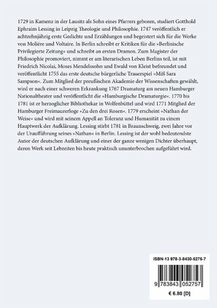 1729 in Kamenz in der Lausitz als Sohn eines Pfarrers geboren, studiert Gotthold Ephraim Lessing in Leipzig Theologie und Philosophie. 1747 veröffentlich er achtzehnjährig erste Gedichte und Erzählungen und begeistert sich für die Werke von Molière und Voltaire. In Berlin schreibt er Kritiken für die "Berlinische Privilegierte Zeitung" und schreibt an ersten Dramen. Zum Magister der Philosophie promoviert, nimmt er am literarischen Leben Berlins teil, ist mit Friedrich Nicolai, Moses Mendelssohn und Ewald von Kleist befreundet und veröffentlicht 1755 das erste deutsche bürgerliche Trauerspiel "Miß Sara Sampson". Zum Mitglied der preußischen Akademie der Wissenschaften gewählt, wird er nach einer schweren Erkrankung 1767 Dramaturg am neuen Hamburger Nationaltheater und veröffentlicht die "Hamburgische Dramaturgie". 1770 bis 1781 ist er herzoglicher Bibliothekar in Wolfenbüttel und wird 1771 Mitglied der Hamburger Freimaurerloge "Zu den drei Rosen". 1779 erscheint "Nathan der Weise" und wird mit seinem Appell an Toleranz und Humanität zu einem Hauptwerk der Aufklärung. Lessing stirbt 1781 in Braunschweig, zwei Jahre vor der Uraufführung seines "Nathan" in Berlin. Lessing ist der wohl bedeutendste Autor der deutschen Aufklärung und einer der ganze wenigen Dichter überhaupt, deren Werk seit Lebzeiten bis heute praktisch ununterbrochen aufgeführt wird.