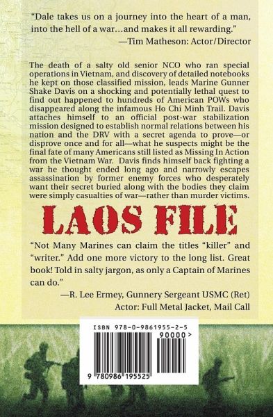 Laos File is a 2011 gold medal winner from the Military Writers Society of America! The death of a salty old senior NCO who ran special operations in Vietnam, and discovery of detailed notebooks he kept on those classified missions, leads Marine Gunner Shake Davis on a shocking and potentially lethal quest to find out happened to hundreds of American POWs who disappeared along the infamous Ho Chi Minh Trail. Davis attaches himself to an official post-war stabilization mission designed to establish normal relations between his nation and the DRV with a secret agenda to prove - or disprove once and for all - what he suspects might be the final fate of many Americans still listed as Missing In Action from the Vietnam War. Davis finds himself back fighting a war he thought ended long ago and narrowly escapes assassination by former enemy forces who desperately want their secret buried along with the bodies they claim were simply casualties of war ... rather than murder victims. "Not Many Marines can claim the titles "killer" and "writer." Add one more victory to the long list. Great book! Told in salty jargon, as only a Captain of Marines can do." --R. Lee Ermey, Gunnery Sergeant USMC (Ret), Actor: Full Metal Jacket, Mail Call