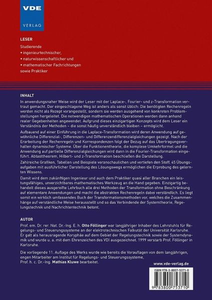 In anwendungsnaher Weise wird der Leser mit der Laplace-, Fourier- und z-Transformation vertraut gemacht. Der eingeschlagene Weg ist anders als sonst üblich: Die benötigten Rechenregeln werden nicht als Rezept vorangestellt, sondern sie werden ausgehend von konkreten Problemstellungen hergeleitet. Die notwendigen mathematischen Operationen werden dann anhand realer Gegebenheiten angewendet. Aufgrund dieses einzigartigen Konzepts wird dem Leser ein Verständnis der Methoden - die sonst häufig unverständlich bleiben - ermöglicht.Aufbauend auf einer Einführung in die Laplace-Transformation wird deren Anwendung auf gewöhnliche Differenzial-, Differenzen- und Differenzendifferenzialgleichungen gezeigt. Nach der Erarbeitung der Rechenregeln und Korrespondenzen folgt der Bezug auf das Übertragungsverhalten dynamischer Systeme. Über die Funktionentheorie, die komplexe Umkehrformel und die Anwendung auf partielle Differenzialgleichungen wird dann in die Fourier-Transformation eingeführt. Abtasttheorem, Hilbert- und z-Transformation beschließen die Darstellung.Zahlreiche Grafiken, Tabellen und Beispiele veranschaulichen und vertiefen den Stoff. 45 Übungsaufgaben mit ausführlicher Darstellung des Lösungswegs ermöglichen die Erprobung des gelernten Wissens.Damit wird dem zukünftigen Ingenieur und auch dem Praktiker quasi aller Branchen ein leistungsfähiges, unverzichtbares mathematisches Werkzeug an die Hand gegeben. Einzigartig behandelt dieses ausgereifte Lehrbuch alle drei Methoden der Transformation ohne Beschränkung auf elementare Anwendungen und macht die abstrakten Rechenregeln dabei verständlich. Es liegt somit ein wirklich umfassendes Buch der Transformationsmethoden vor, welches die Zusammenhänge auf verständliche Weise herausstellt und so das Verbindende der Systemtheorie, Regelungstechnik und Nachrichtentechnik betont.