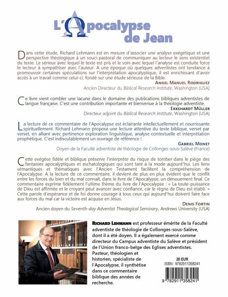 Commentaire biblique, verset par verset de l'Apocalypse de Jean. Dans cette étude, Richard Lehmann associe analyse exégétique et perspective théologique tout en cherchant à communiquer le sens existentiel au lecteur. La lecture de ce commentaire de l'Apocalypse est éclairante intellectuellement et nourrissante spirituellement.