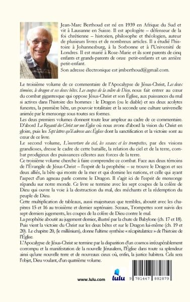 Le troisième volume de ce commentaire de l'Apocalypse de Jésus-Christ, Les deux témoins, le dragon et ses deux bêtes. Les coupes de la colère de Dieu, nous fait entrer au cur du combat gigantesque qui oppose Jésus-Christ et son Église, aux puissances du mal si actives dans l'histoire des hommes : le Dragon (ou le diable) et ses deux acolytes funestes, la première bête, un pouvoir totalitaire et la seconde une culture universelle animée par le mensonge sous toutes ses formes. Les deux premiers volumes donnent toute leur ampleur au cadre de ce commentaire. D'abord La Royauté du Christ sur son Église où nous avons d'abord la vision du Christ en gloire, puis les Sept lettres qu'il adresse aux Églises dont la sanctification et la victoire sont au cur de ce livre. Le second volume, L'ouverture du ciel, les sceaux et les trompettes, par des visions grandioses, dresse le cadre de cette bataille, la relation du ciel et de la terre, combat prodigieux des puissances célestes aux forces de la terre. Ce troisième volume cherche à faire comprendre ce combat. Face aux deux témoins de l'Évangile de Jésus-Christ - l'esprit de la prophétie - se trouve le Dragon et ses deux alliés, la bête qui monte de la mer et qui domine les nations, et celle qui ayant l'aspect d'un agneau parle comme le Dragon. Il s'agit ici de l'esprit de mensonge répandu sur notre monde. Ce livre se termine avec les sept coupes de la colère de Dieu qui ouvre la voie à la destruction du mal, des méchants et la rédemption du peuple de Dieu. Cette multiplication de tableaux, aussi majestueux que terribles, aboutit avec les chapitres 15 et 16 au troisième et dernier septénaire. Sceaux, Trompettes sont suivis des sept derniers jugements, les coupes de la colère de Dieu contre le mal. La prophétie aboutit au jugement dernier, illustré par la chute de Babylone (ch. 17 et 18). Puis vient la victoire du Christ sur les deux bêtes et sur le Dragon lui-même (ch. 19 et 20). Le chapitre 20, (le millénium), donne l'ultime synthèse récapitulatrice de l'histoire de l'Église. L'Apocalypse de Jésus-Christ se termine par la disparition d'un cosmos irrécupérablement corrompu et la manifestation de la nouvelle Jérusalem, l'Église dans toute sa splendeur ainsi qu'une nouvelle terre et de nouveaux cieux où, enfin, la justice habitera. Cela sera l'objet, Dieu voulant, d'un quatrième volume.