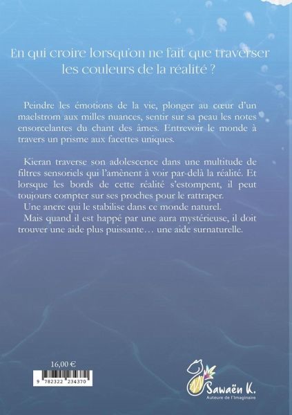 « En qui croire lorsqu'on ne fait que traverser les couleurs de la réalité ? »Peindre les émotions de la vie, plonger au coeur d'un maelstrom aux milles nuances, sentir sur sa peau les notes ensorcelantes du chant des âmes. Entrevoir le monde à travers un prisme aux facettes uniques.Kieran traverse son adolescence dans une multitude de filtres sensoriels qui l'amènent à voir par-delà la réalité. Et lorsque les bords de cette réalité s'estompent, il peut toujours compter sur ses proches pour le rattraper.Une ancre qui le stabilise dans ce monde naturel.Mais quand il est happé par une aura mystérieuse, il doit trouver une aide plus puissante... une aide surnaturelle.