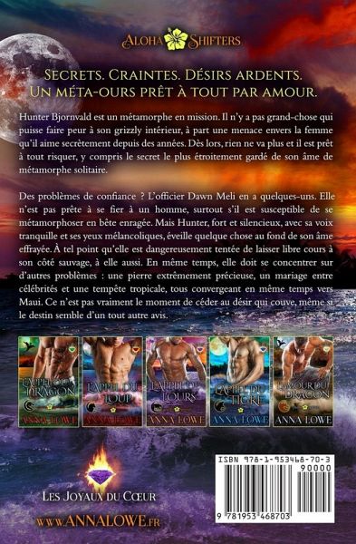 Secrets. Craintes. Désirs ardents. Un méta-ours prêt à tout par amour. Hunter Bjornvald est un métamorphe en mission. Il n'y a pas grand-chose qui puisse faire peur à son grizzly intérieur, à part une menace envers la femme qu'il aime secrètement depuis des années. Dès lors, rien ne va plus et il est prêt à tout risquer, y compris le secret le plus étroitement gardé de son âme de métamorphe solitaire. Des problèmes de confiance ? L'officier Dawn Meli en a quelques-uns. Elle n'est pas prête à se fier à un homme, surtout s'il est susceptible de se métamorphoser en bête enragée. Mais Hunter, fort et silencieux, avec sa voix tranquille et ses yeux mélancoliques, éveille quelque chose au fond de son âme effrayée. À tel point qu'elle est dangereusement tentée de laisser libre cours à son côté sauvage, à elle aussi. En même temps, elle doit se concentrer sur d'autres problèmes : une pierre extrêmement précieuse, un mariage entre célébrités et une tempête tropicale, tous convergeant en même temps vers Maui. Ce n'est pas vraiment le moment de céder au désir qui couve, même si le destin semble d'un tout autre avis. ALOHA SHIFTERS : LES JOYAUX DU CUR est une nouvelle série palpitante se déroulant sur les rivages tropicaux de Maui. Chaque tome est bourré d'action, d'émotion et d'amour et vous tiendra en haleine¿! Si vous aimez la série Magnum, les métamorphes et les mâles alpha torrides, alors vous adorerez ces livres¿! Tome 1 : L'appel du dragon Tome 2 : L'appel du loup Tome 3 : L'appel de l'ours Tome 4 : L'appel du tigre Tome 5 : L'amour du dragon Tome 6 : L'appel du renard Chaque tome est une romance paranormale à part entière qui ne se termine pas sur un cliffhanger. Contenu pour adulte. Vous trouverez dans ces histoires des héroïnes fortes, des mâles alpha, des loups-garous et métamorphes, des milliardaires, de la romance militaire, du suspense paranormal, de l'action, de l'aventure et des décors tropicaux exotiques!