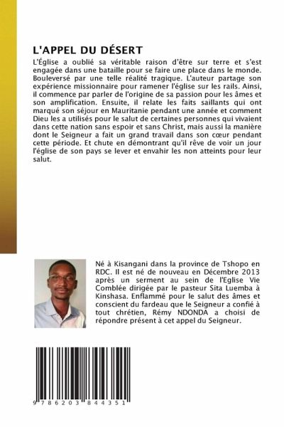 L'Église a oublié sa véritable raison d'être sur terre et s'est engagée dans une bataille pour se faire une place dans le monde. Bouleversé par une telle réalité tragique. L'auteur partage son expérience missionnaire pour ramener l'église sur les rails. Ainsi, il commence par parler de l'origine de sa passion pour les âmes et son amplification. Ensuite, il relate les faits saillants qui ont marqué son séjour en Mauritanie pendant une année et comment Dieu les a utilisés pour le salut de certaines personnes qui vivaient dans cette nation sans espoir et sans Christ, mais aussi la manière dont le Seigneur a fait un grand travail dans son coeur pendant cette période. Et chute en démontrant qu'il rêve de voir un jour l'église de son pays se lever et envahir les non atteints pour leur salut.