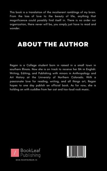 This book is a translation of the incoherent ramblings of my brain. From the loss of love to the beauty of life, anything that magnificence could possibly find itself in. There is no order nor organization, there never will be, you simply just have to read and wonder.