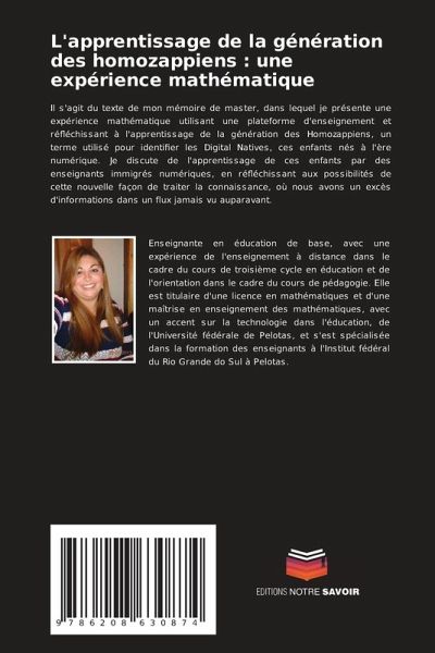 Il s'agit du texte de mon mémoire de master, dans lequel je présente une expérience mathématique utilisant une plateforme d'enseignement et réfléchissant à l'apprentissage de la génération des Homozappiens, un terme utilisé pour identifier les Digital Natives, ces enfants nés à l'ère numérique. Je discute de l'apprentissage de ces enfants par des enseignants immigrés numériques, en réfléchissant aux possibilités de cette nouvelle façon de traiter la connaissance, où nous avons un excès d'informations dans un flux jamais vu auparavant.
