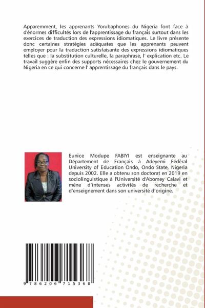 Apparemment, les apprenants Yorubaphones du Nigeria font face à d'énormes difficultés lors de l'apprentissage du français surtout dans les exercices de traduction des expressions idiomatiques. Le livre présente donc certaines stratégies adéquates que les apprenants peuvent employer pour la traduction satisfaisante des expressions idiomatiques telles que : la substitution culturelle, la paraphrase, l' explication etc. Le travail suggère enfin des supports nécessaires chez le gouvernement du Nigeria en ce qui concerne l' apprentissage du français dans le pays.