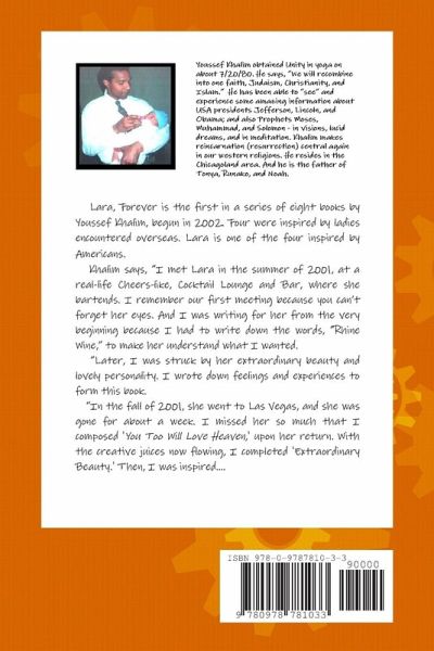 "Lara, Forever" is the first in a series of eight books by Youssef Khalim, begun in 2002. Four were inspired by ladies encountered overseas. Lara is one of the four inspired by Americans. Khalim says, "I met Lara in the summer of 2001, at a real-life Cheers-like, Cocktail Lounge and Bar, where she bartends. I remember our first meeting because you can't forget her eyes. And I was writing for her from the very beginning because I had to write down the words, 'Rhine Wine,' to make her understand what I wanted. "Later, I was struck by her extraordinary beauty and lovely personality. I wrote down feelings and experiences to form this book. "In the fall of 2001, she went to Las Vegas, and she was gone for about a week. I missed her so much that I composed 'You Too Will Love Heaven,' upon her return. With the creative juices now flowing, I completed 'Extraordinary Beauty.' Then, I was inspired to do 'Golden Girl,' and later, 'Signs I'm Falling In Love With You,' by Lara, and one of our mutual...."