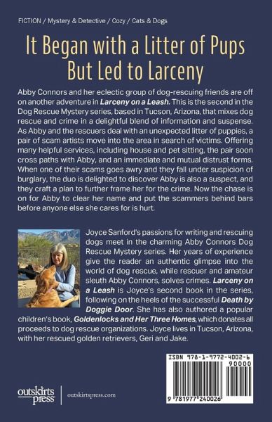 Dog rescuer Abby Connors finds herself once again caught up in crime as scam artists work to frame her. Fortunately, Abby has friends just panting to help her: along with police canines, she catches the criminals and saves the day. Larceny on a Leash: An Abby Connors Dog Rescue Mystery is the second in a new cozy mystery series by Joyce Sanford, who has worked in dog rescue for almost two decades. Full of caring, hardworking, quirky characters, fascinating stories of dog rescue, a gorgeous but also turbulent setting, and of course, crimes to solve, Larceny on a Leash will delight readers-and help a good cause as the proceeds go to the Southern Arizona Golden Retriever Rescue.