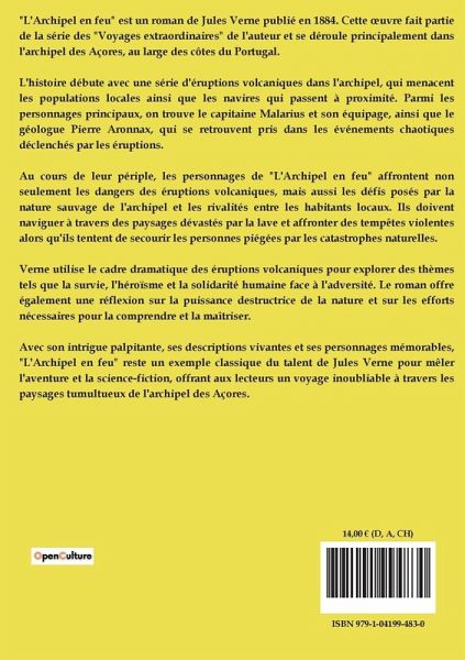 "L'Archipel en feu" est un roman de Jules Verne publié en 1884. Cette ¿uvre fait partie de la série des "Voyages extraordinaires" de l'auteur et se déroule principalement dans l'archipel des Açores, au large des côtes du Portugal. L'histoire débute avec une série d'éruptions volcaniques dans l'archipel, qui menacent les populations locales ainsi que les navires qui passent à proximité. Parmi les personnages principaux, on trouve le capitaine Malarius et son équipage, ainsi que le géologue Pierre Aronnax, qui se retrouvent pris dans les événements chaotiques déclenchés par les éruptions. Au cours de leur périple, les personnages de "L'Archipel en feu" affrontent non seulement les dangers des éruptions volcaniques, mais aussi les défis posés par la nature sauvage de l'archipel et les rivalités entre les habitants locaux. Ils doivent naviguer à travers des paysages dévastés par la lave et affronter des tempêtes violentes alors qu'ils tentent de secourir les personnes piégées par les catastrophes naturelles. Verne utilise le cadre dramatique des éruptions volcaniques pour explorer des thèmes tels que la survie, l'héroïsme et la solidarité humaine face à l'adversité. Le roman offre également une réflexion sur la puissance destructrice de la nature et sur les efforts nécessaires pour la comprendre et la maîtriser. Avec son intrigue palpitante, ses descriptions vivantes et ses personnages mémorables, "L'Archipel en feu" reste un exemple classique du talent de Jules Verne pour mêler l'aventure et la science-fiction, offrant aux lecteurs un voyage inoubliable à travers les paysages tumultueux de l'archipel des Açores.