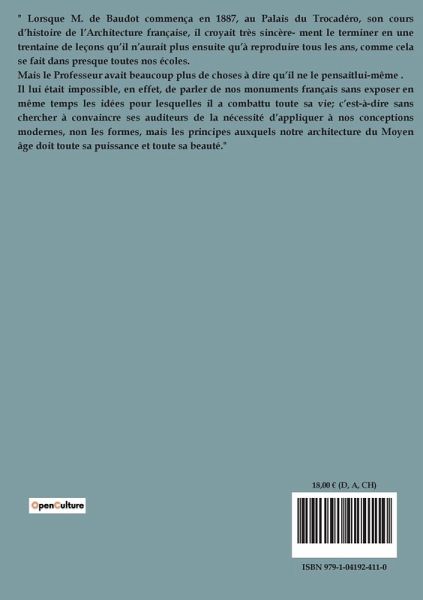 " Lorsque M. de Baudot commença en 1887, au Palais du Trocadéro, son cours d¿histoire de l¿Architecture française, il croyait très sincère- ment le terminer en une trentaine de leçons qüil n¿aurait plus ensuite qüà reproduire tous les ans, comme cela se fait dans presque toutes nos écoles. Mais le Professeur avait beaucoup plus de choses à dire qüil ne le pensaitlui-même . Il lui était impossible, en effet, de parler de nos monuments français sans exposer en même temps les idées pour lesquelles il a combattu toute sa vie; c¿est-à-dire sans chercher à convaincre ses auditeurs de la nécessité d¿appliquer à nos conceptions modernes, non les formes, mais les principes auxquels notre architecture du Moyen âge doit toute sa puissance et toute sa beauté."