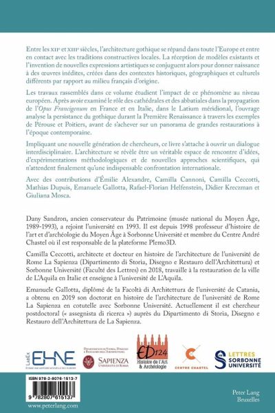 Les travaux rassemblés dans ce volume étudient l'impact de ce phénomène au niveau européen. Après avoir examiné le rôle des cathédrales et des abbatiales dans la propagation de l' Opus Francigenum en France et en Italie, dans le Latium méridional, l'ouvrage analyse la persistance du gothique durant la Première Renaissance à travers les exemples de Pérouse et Poitiers, avant de s'achever sur un panorama de grandes restaurations à l'époque contemporaine.