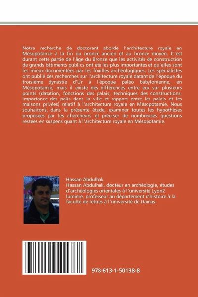 Notre recherche de doctorant aborde l'architecture royale en Mésopotamie à la fin du bronze ancien et au bronze moyen. C'est durant cette partie de l'âge du Bronze que les activités de construction de grands bâtiments publics ont été les plus importantes et qu'elles sont les mieux documentées par les fouilles archéologiques. Les spécialistes ont publié des recherches sur l'architecture royale datant de l'époque du troisième dynastie d'Ur à l'époque paléo babylonienne, en Mésopotamie, mais il existe des différences entre eux sur plusieurs points (datation, fonctions des palais, techniques des constructions, importance des palis dans la ville et rapport entre les palais et les maisons privées) relatif à l'architecture royale en Mésopotamie. Nous souhaitons, dans la présente étude, examiner toutes les hypothèses proposées par les chercheurs et préciser de nombreuses questions restées en suspens quant à l'architecture royale en Mésopotamie.