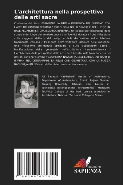 Contenuto del libro: ESAMINARE LA MUTUA INFLUENZA DEL SUFISMO CON L'ARTE DEI GIARDINI PERSIANI / PSICOLOGIA DELLO SPAZIO E DEL LUOGO IN BASE ALL'ARCHITETTURA ISLAMICA IRANIANA / Un saggio sull'importanza dello spazio e del luogo per rendere onore a un'identità duratura / Una riflessione sulla saggezza dell'arte del design e della decorazione nell'architettura tradizionale iraniana / L'essenza dell'architettura islamica delle moschee: Una riflessione sull'identità spirituale e sulle supposizioni sacre / Manifestazione della geometria nell'architettura iraniano-islamica / L'architettura dalla prospettiva delle arti sacre basata sulla trascendenza del design iraniano-islamico / GEOMETRIA NASCOSTA DELL'EDIFICIO ALI QAPU DI ISFAHAN NEL DETERMINARE LA RELAZIONE GEOMETRICA CON LA PIAZZA NAGHSH JAHAN / Estratti dall'architettura islamica iraniana.