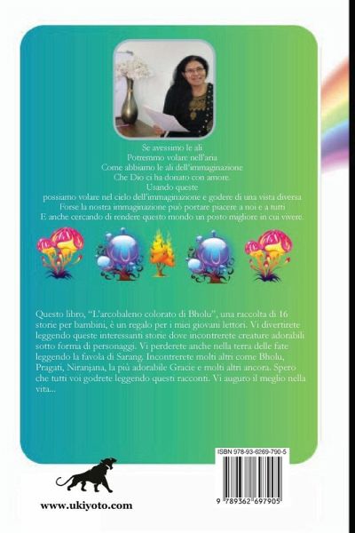 Se avessimo le ali Potremmo volare nell'aria Come abbiamo le ali dell'immaginazione Che Dio ci ha donato con amore. Usando queste possiamo volare nel cielo dell'immaginazione e godere di una vista diversa Forse la nostra immaginazione può portare piacere a noi e a tutti E anche cercando di rendere questo mondo un posto migliore in cui vivere Questo libro, "L'arcobaleno colorato di Bholu", una raccolta di 16 storie per bambini, è un regalo per i miei giovani lettori. Vi divertirete leggendo queste interessanti storie dove incontrerete creature adorabili sotto forma di personaggi. Vi perderete anche nella terra delle fate leggendo la favola di Sarang. Incontrerete molti altri come Bholu, Pragati, Niranjana, la più adorabile Gracie e molti altri ancora. Spero che tutti voi godrete leggendo questi racconti. Vi auguro il meglio nella vita...