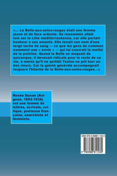 ... La Belle-aux-seins-rouges était une femme jeune et de face ardente. Sa renommée allait loin sur la côte méditerranéenne, car elle portait bonheur à ses amants. Elle tenait son nom d'une large tache de sang - ce que les gens du commun nomment une envie - qui lui couvrait la moitié de la poitrine. Quand la Belle se moquait de quiconque, il devenait ridicule pour le reste de sa vie, à moins qu'il ne quittât Toulon ou pût tuer un des rieurs. Car la gaieté générale accompagnait toujours l'hilarité de la Belle-aux-seins-rouges...