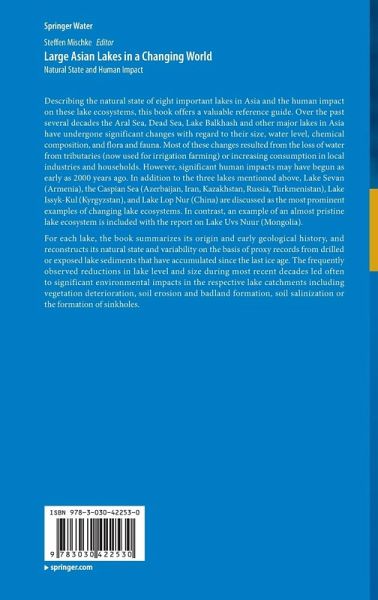 Describing the natural state of eight important lakes in Asia and the human impact on these lake ecosystems, this book offers a valuable reference guide. Over the past several decades the Aral Sea, Dead Sea, Lake Balkhash and other major lakes in Asia have undergone significant changes with regard to their size, water level, chemical composition, and flora and fauna. Most of these changes resulted from the loss of water from tributaries (now used for irrigation farming) or increasing consumption in local industries and households. However, significant human impacts may have begun as early as 2000 years ago. In addition to the three lakes mentioned above, Lake Sevan (Armenia), the Caspian Sea (Azerbaijan, Iran, Kazakhstan, Russia, Turkmenistan), Lake Issyk-Kul (Kyrgyzstan), and Lake Lop Nur (China) are discussed as the most prominent examples of changing lake ecosystems. In contrast, an example of an almost pristine lake ecosystem is included with the report on Lake UvsNuur (Mongolia).