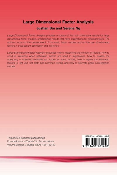 Large Dimensional Factor Analysis provides a survey of the main theoretical results for large dimensional factor models, emphasizing results that have implications for empirical work. The authors focus on the development of the static factor models and on the use of estimated factors in subsequent estimation and inference. Large Dimensional Factor Analysis discusses how to determine the number of factors, how to conduct inference when estimated factors are used in regressions, how to assess the adequacy pf observed variables as proxies for latent factors, how to exploit the estimated factors to test unit