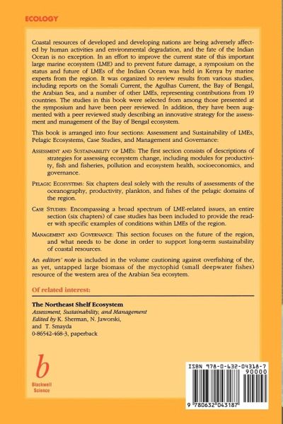 In this volume marine experts from countries of East Africa and southern Asia describe the conditions of marine resources of the large marine ecosystems of the Indian Ocean. Countries of the region represent over a quarter of the world's population, most of whom are existing at or below the poverty level. The potentials for economic growth through the development of coastal tourism, mariculture, fisheries, mineral extraction, and oil and gas production are examined by the authors in relation to the need for ensuring the long-term sustainability of marine resources. Case studies of resource assessments presented by several authors illustrate the magnitude of risk from continuing degradation of resources under the prevailing unmanaged conditions extending over much of coastal areas of East Africa and southern Asia. The authors explore the application of multidisciplinary ecosystem-based assessment and management strategies to the future economic development of the large marine ecosystems of the region. With the initiation of science-based management practcies, the ecosystems of the area can provide an important source of economic growth, improved food security, and nutritional benefits to the populations of stakeholders in coastal areas bordering the Indian Ocean