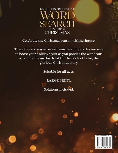 Celebrate the Christmas season with scripture! These fun and easy-to-read word search puzzles are sure to boost your holiday spirit as you ponder the wondrous account of Jesus' birth told in the book of Luke, the glorious and beloved Christmas story. With each of the thirty-three verses as its own puzzle, you can cheerfully count down the days until Christmas. Or, use the puzzles to relax whenever you need a break from holiday stress. This book's unique design may help you memorize scripture! Each set of facing pages includes both the Bible verse and a corresponding list of words written in the correct reading order, instead of alphabetically, to help you remember the scripture verses as you complete the puzzles. *Makes a great gift or stocking stuffer!* This word search puzzle book features: · Bible verses. · Large print. · Multi-directional. · Solutions included. · Suitable for all ages. · Beautiful and unique design. · 8.5 X 11 inches (21.59 X 27.94 cm)