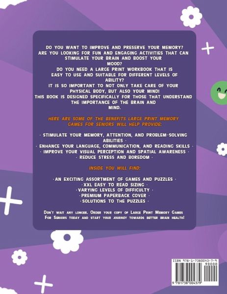 Do you want to improve and preserve your memory? Are you looking for fun and engaging activities that can stimulate your brain and boost your mood? Do you need a large print workbook that is easy to use and suitable for different levels of ability? It is so important to not only take care of your physical body, but also your mind! This book is designed specifically for those that understand the importance of the brain and mind. Here are some of the benefits Large Print Memory Games For Seniors will help provide: · Stimulate your memory, attention, and problem-solving abilities · Enhance your language, communication, and reading skills · Improve your visual perception and spatial awareness · Reduce stress and boredom Inside you will find: . An exciting assortment of games and puzzles . XXL easy to read sizing . Varying levels of difficulty . Premium paperback cover . Solutions to the puzzles