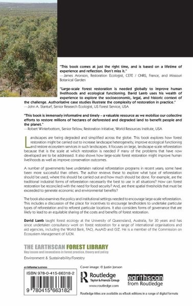 David Lamb taught forest ecology at the University of Queensland, Australia, for 30 years and has since undertaken consultancy work on forest restoration for a range of international organizations and aid agencies, including the World Bank, FAO, AusAID and GTZ. He is a member of the Commissiono n Ecosystem Management of IUCN.