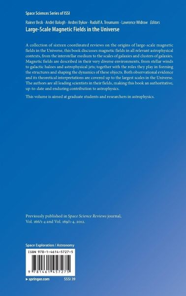 Dr. Rainer Beck is senior researcher at the Max Planck Institute for Radio Astronomy in Bonn, Germany. He has been working on galactic magnetic fields since the 1970s, published about 400 papers and organized the first IAU conference on this topic in 1989. He is Principle Investigator of the LOFAR Key Science Project on Cosmic Magnetism and member of the Science Working Group of the Square Kilometre Array. Prof. André Balogh is Emeritus Professor of Space Physics in Imperial College London and a past Director of the International Space Science Institute in Bern, Switzerland. He has participated in numerous scientific space missions since the mid¿1960s and has been a Principal Investigator on the Ulysses and Cluster missions. His principal research interest is the observation and study of magnetic fields in the heliosphere and in planetary environments. He is author and co¿author of over 450 scientific publications and editor of seven books on solar system topics. Prof. Andrei Bykov is head of the High Energy Astrophysics laboratory at the Ioffe Institute of Physics and Technology at the Russian Academy of Sciences; and professor of St. Petersburg State Politechnical University. His principal research interests are theory and observations of processes in astrophysical objects with extreme energy release ¿ supernovae, gammäray bursts and clusters of galaxies. He is author and coauthor of over 200 scientific publications, including the book 'Turbulence, Current Sheets and Shocks in Cosmic Plasma' and editor of four books on high energy astrophysics. Prof. Rudolf Treumann is a retired faculty member from the Department of Geophysics and Environmental Sciences at Ludwig¿Maximilians University in Munich, Germany. He has published widely on plasma physics and astrophysical topics. He is an author of a two¿volume textbook on space plasma physics and coeditor of several books on fundamental physics and astrophysics. Lawrence Widrow is a Professor in the Department of Physics, Engineering Physics, and Astronomy at Queen's University in Kingston, Canada. His research interests include the physics of the early Universe, the structure of dark matter halos, particle physics candidates of dark matter, and galactic dynamics. He is author and co¿author of nearly 100 scientific publications.